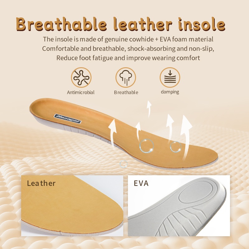 Echt koeienhuid + binnenzool van EVA-schuim: ademend, schokabsorberend en antislip. Zorgt ervoor dat de voeten kilometer na kilometer fris aanvoelen.