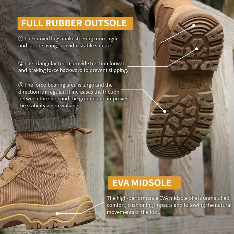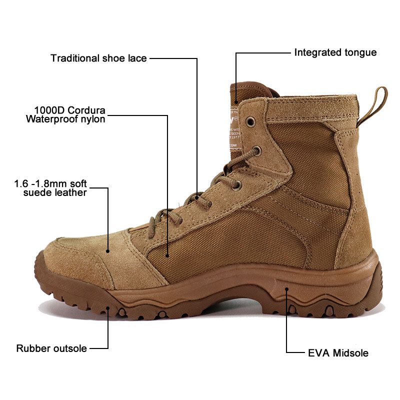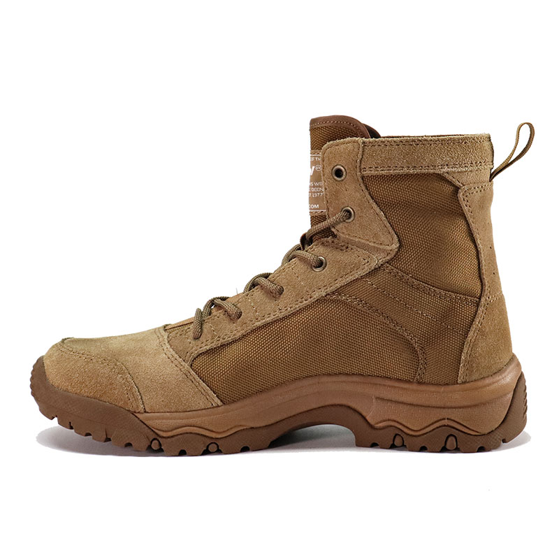 Van rotsachtige wadi's tot losse zandduinen, de Cordura Fabric Rubber Desert Tactical Boots zijn ontworpen om te presteren. Het duurzame bovenwerk van Cordura is bestand tegen slijtage en houdt het gewicht laag, en de multidirectionele rubberen buitenzool zorgt voor een stevige houvast op onvoorspelbare woestijnoppervlakken. Stuur ons een aanvraag voor meer informatie.