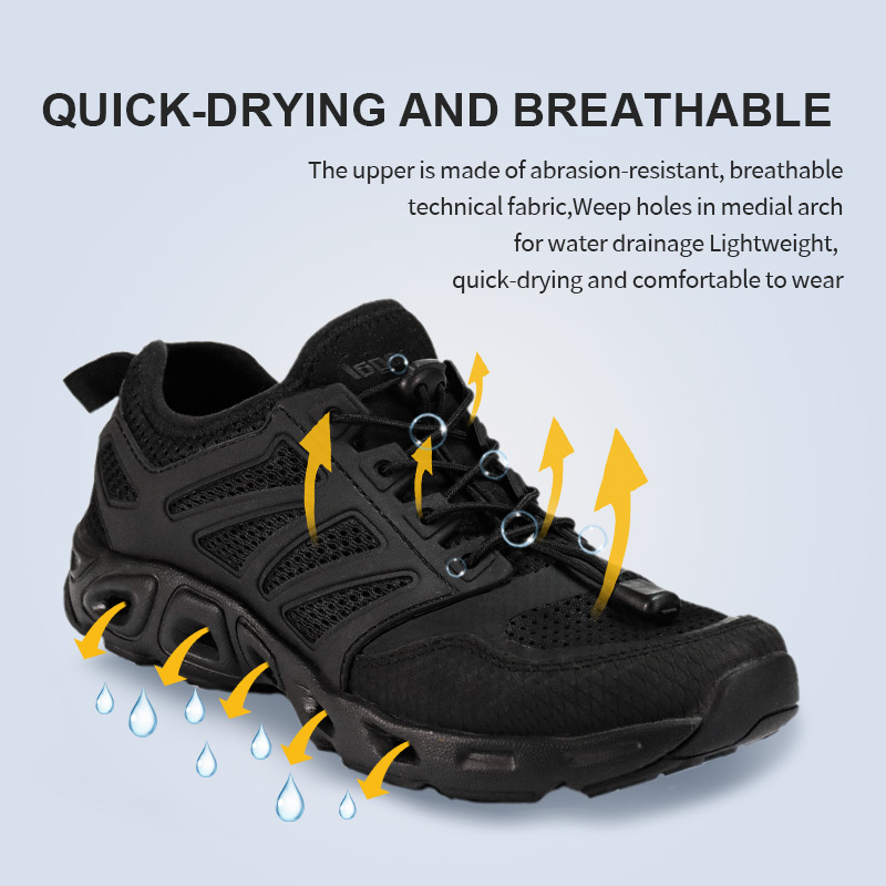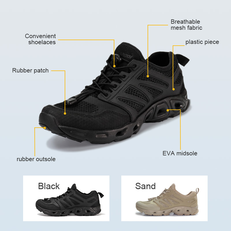 -Lichtgewicht en ademend -Drainage en sneldrogend -EVA schokabsorberende tussenzool -Handig schoenveterontwerp