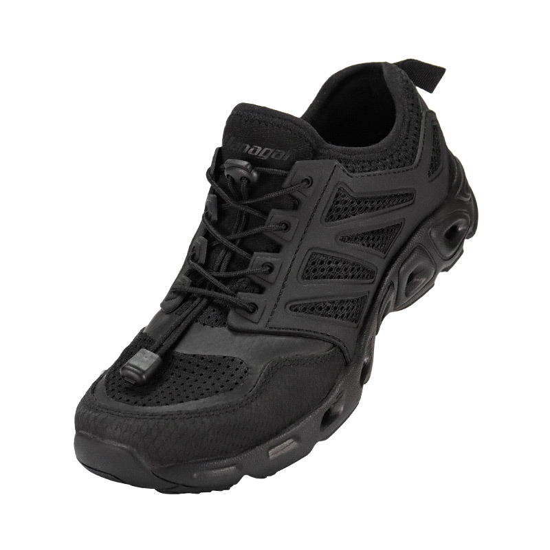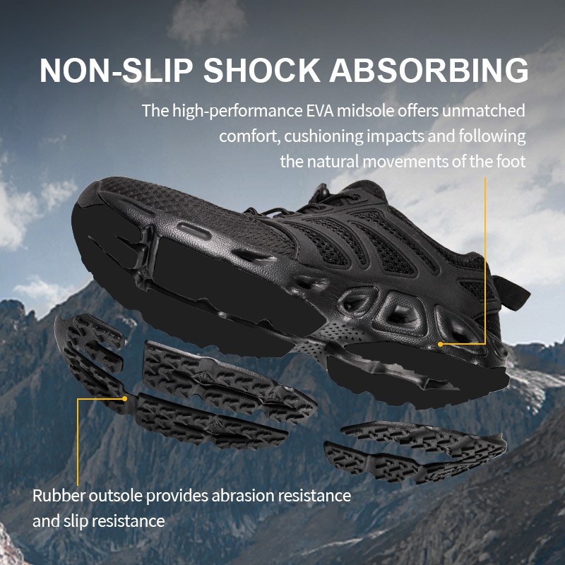 EVA-schokabsorberende trekkingschoenen zijn gemaakt voor het parcours, nat of droog. Met sneldrogende materialen en afvoerpoorten in de boog voert het water snel af als je van beek naar top gaat. Een rubberen hielstuk zorgt voor stabiliteit, terwijl de EVA-tussenzool zacht, schokabsorberend comfort onder de voeten biedt. En de robuuste rubberen buitenzool? Gebouwd om vrijwel alles vast te houden: rotsen, modder, los grind. Het is amfibisch, wendbaar en gebouwd om met je mee te bewegen.