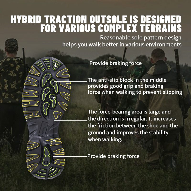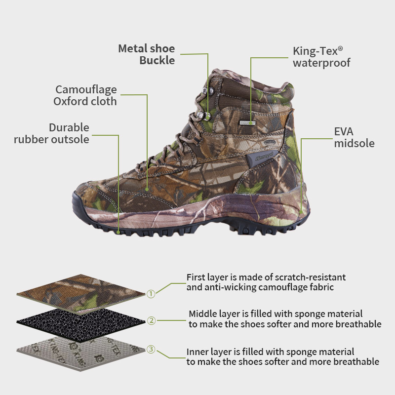 ①Poliyou vochtafvoerende binnenzool met hoge rekbaarheid houdt de binnenkant droog. ②EVA-tussenzool, omwikkeld met camouflagedoek, demping en schokabsorptie. ③Duurzame rubberen buitenzool, antislip en slijtvast.
