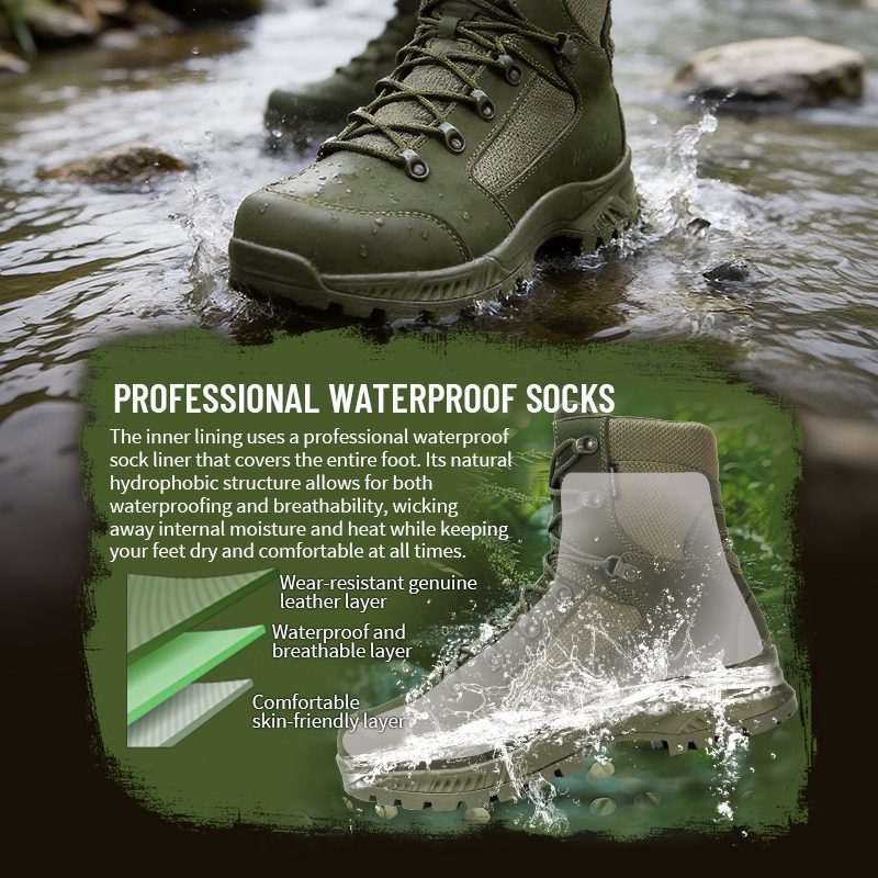 De binnenvoering maakt gebruik van een professionele waterdichte sok die de hele voet bedekt. De natuurlijke hydrofobe structuur houdt water buiten en laat warmte en zweet ontsnappen, zodat je voeten droog en comfortabel blijven.