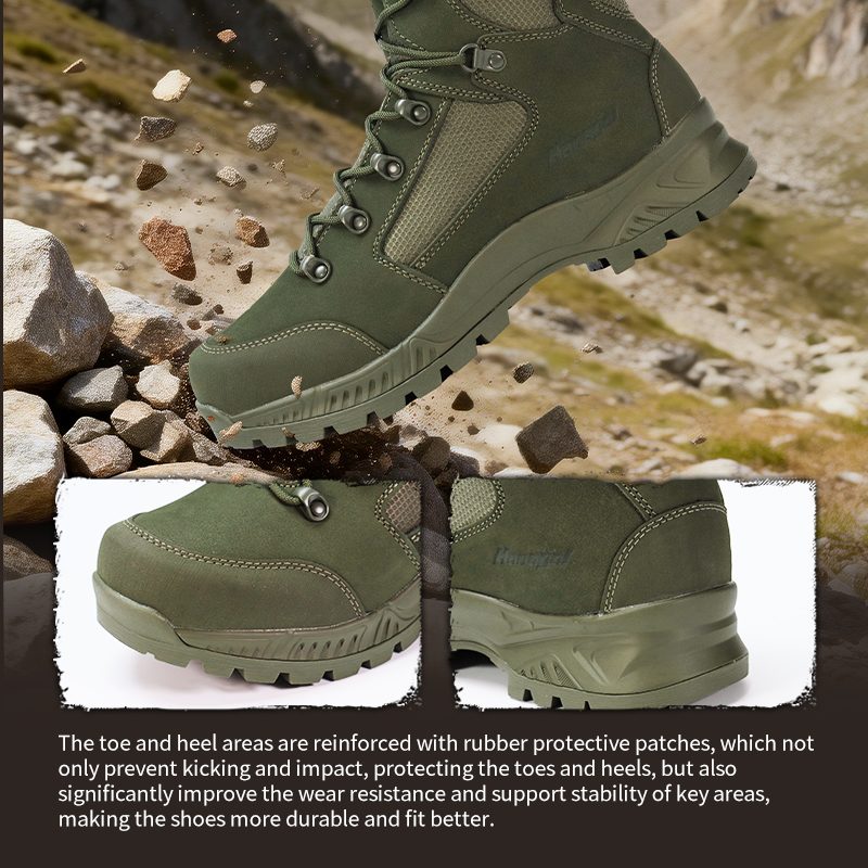 ①Dat is een serieuze rubberen buitenzool. Hij bijt zich in de grond, houdt je stabiel en laat niet los als het glad wordt. ②PU-tussenzool die is gebouwd om de angel uit harde grond te halen. Minder schokken, minder vermoeidheid. Je voeten zullen het verschil merken.