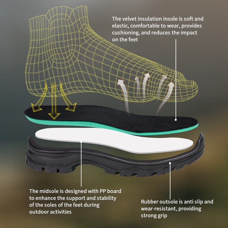 ①Fluwelen voering. Zacht onder de voeten. Absorbeert de impact. ②PP-tussenzool voor stabiele ondersteuning. ③Rubberen buitenzool die niet loslaat. Grijpt, gaat mee, blijft betrouwbaar.